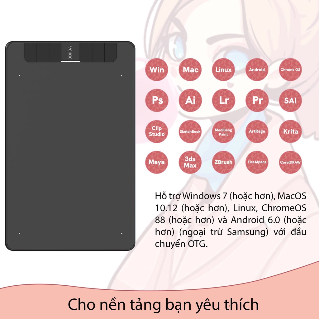 - VK640 tương thích với Windows 10/8/7, hệ điều hành Mac OS 10.12, Android 6.0 trở lên. Và tương thích với hầu hết các phần mềm vẽ như: Adobe Photoshop, Krita, Adobe Illustrator, Corel Painter, Clip Studio, SAI, Zbrush, Medibang, Toonboom Harmony,…