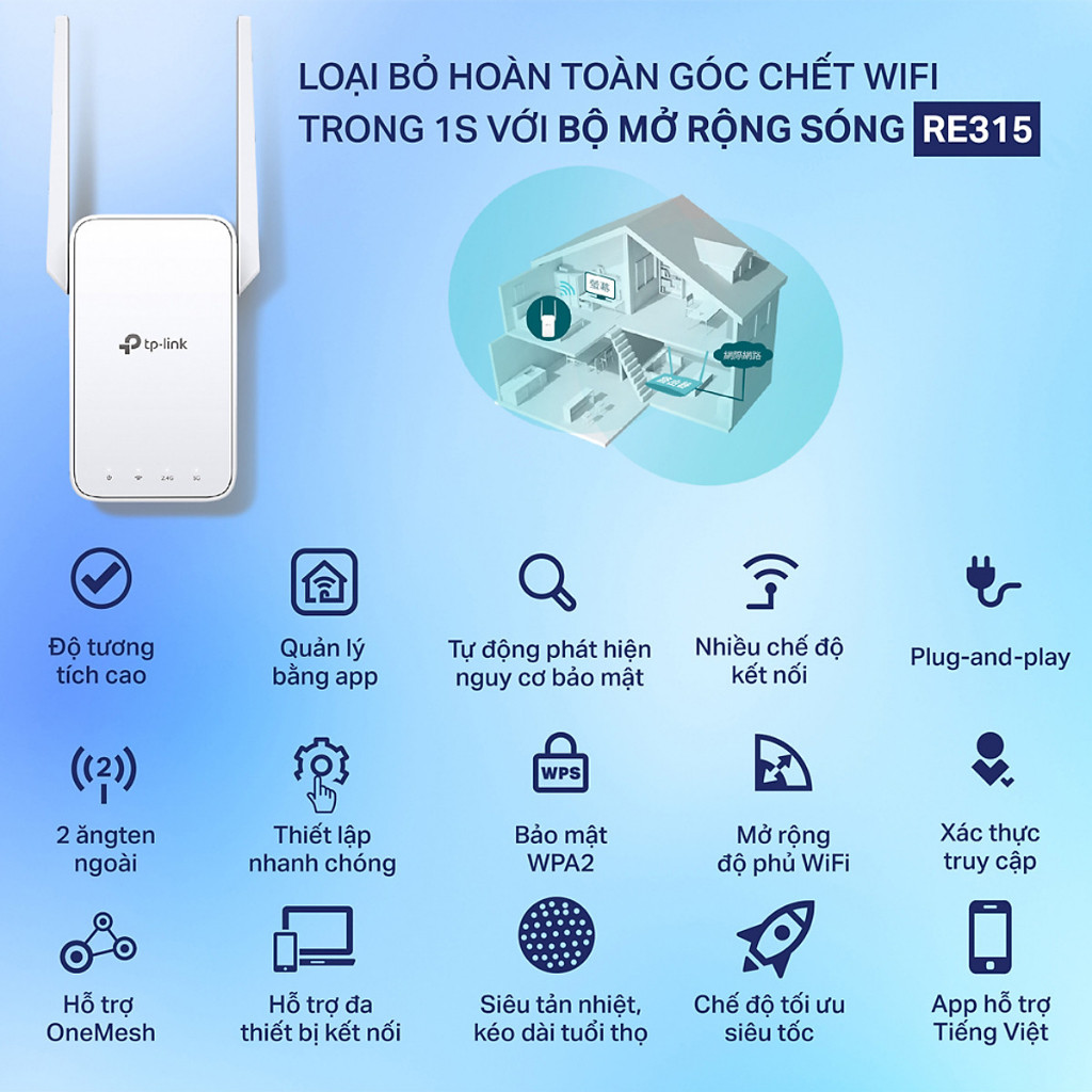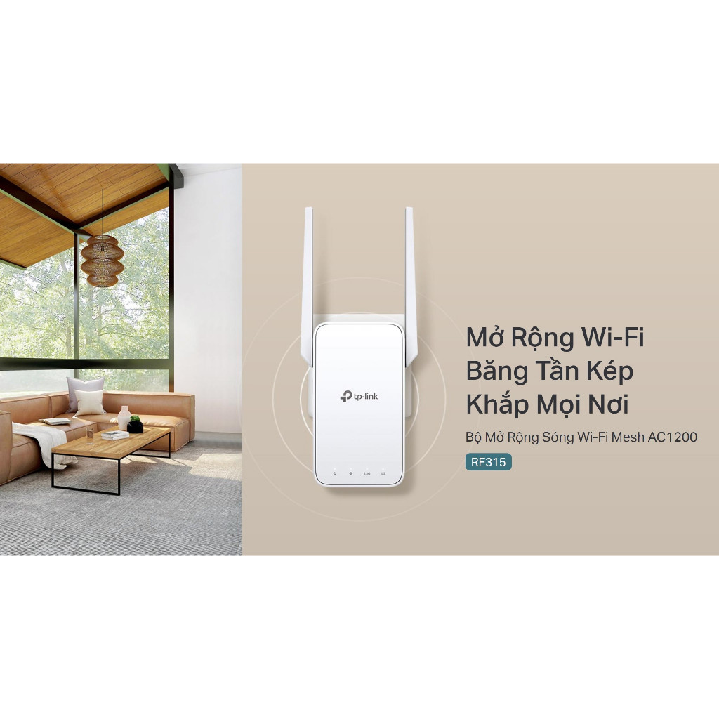 - RE315 cung cấp băng tần kép (2.4 GHz và 5 GHz) để truyền tín hiệu Wi-Fi, tăng gấp đôi hiệu suất của mỗi băng tần. Nó cho phép bạn kết nối nhiều thiết bị hơn cùng lúc với băng tần kép 300 Mbps 2.4 GHz và 867 Mbps 5 GHz. Băng tần 2.4 GHz cho các tác vụ đơn giản như gửi email và duyệt web và băng tần 5 GHz để chơi game và phát trực tuyến HD.
