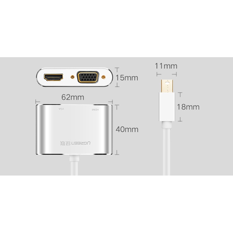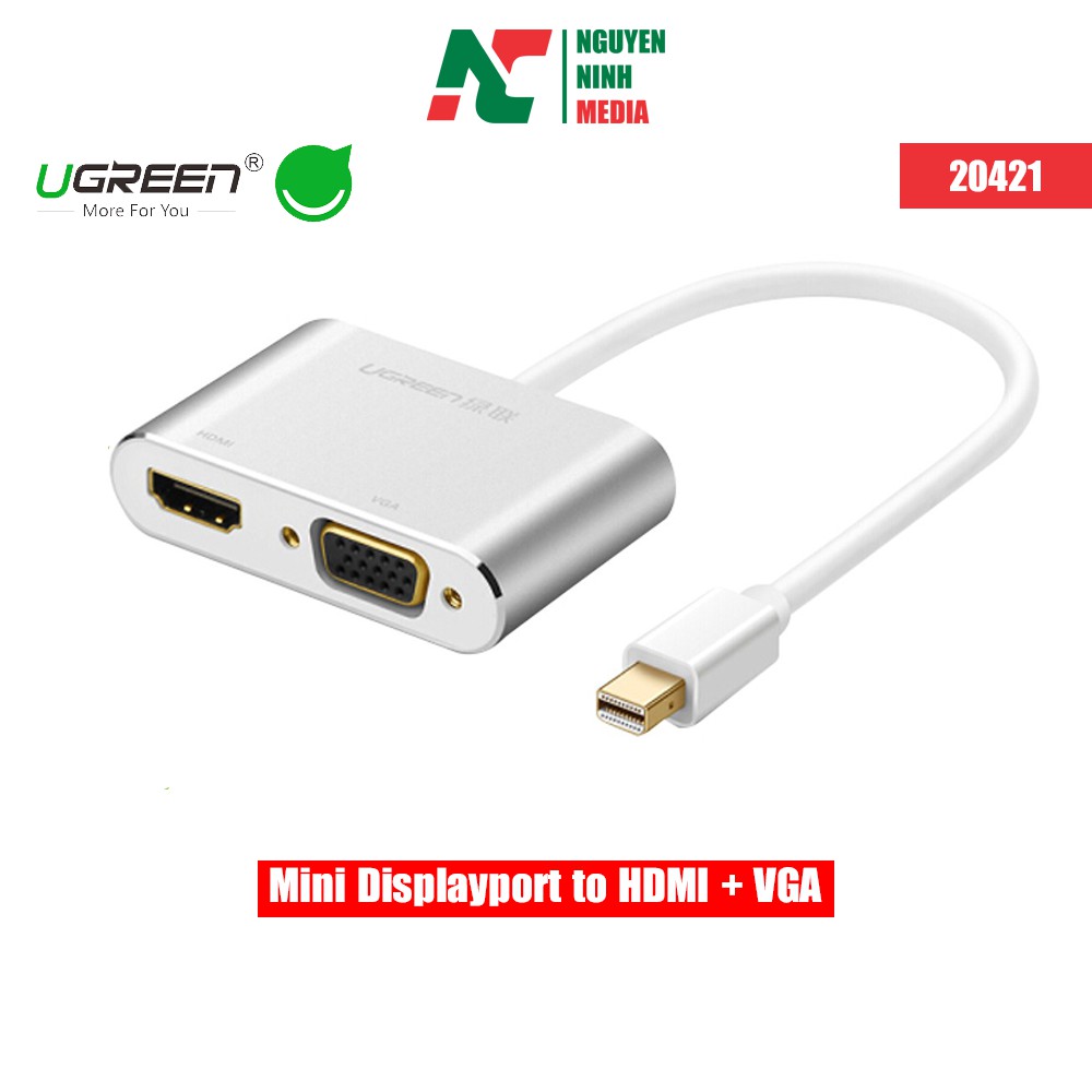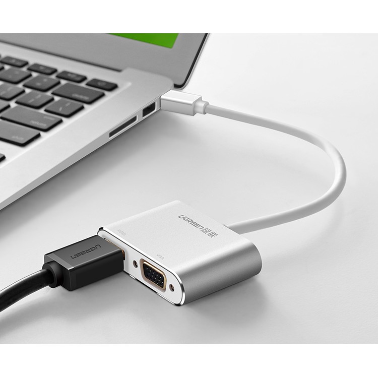 - Cáp Mini DisplayPort To HDMI + VGA Ugreen (20421) giúp chuyển đổi tín hiệu từ laptop, PC sang HDTV, màn hình LCD. HDMI hỗ trợ Full HD1080p, có cả hình ảnh và âm thanh.