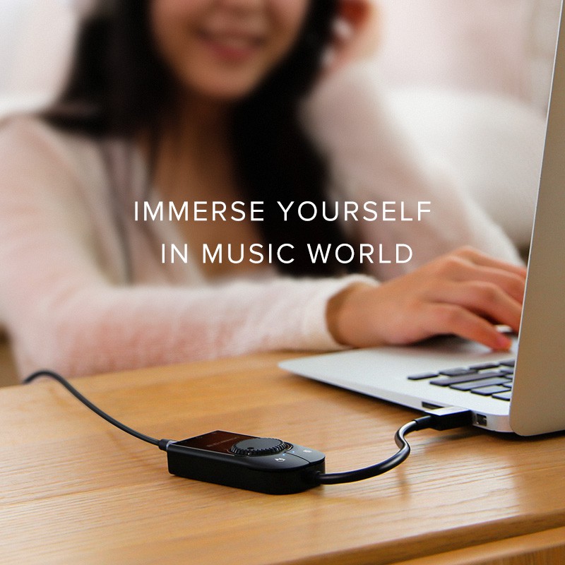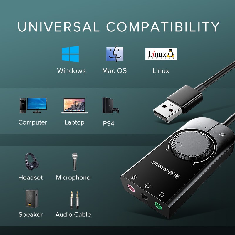 Có thể được sử dụng cho máy tính để bàn PC, máy tính xách tay, PS4, máy chơi game PS4 pro, để giải quyết thiệt hại của card âm thanh máy tính và việc sử dụng bảng điều khiển trò chơi với tai nghe. Sản phẩm này không thể được sử dụng trên TV, DVD và dàn âm thanh chung. Sản phẩm không cần cài đặt trình điều khiển, cắm và sử dụng, tương thích với hệ thống Windows\ macOS\ Linux.