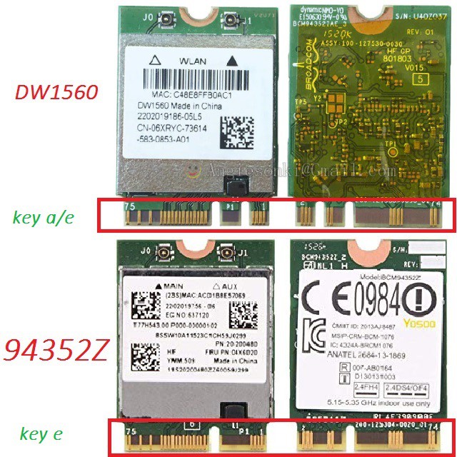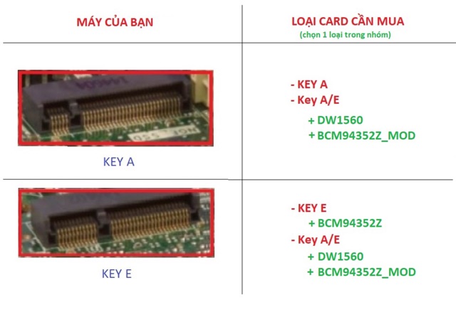 Lưu ý: Card mã BCM94352Z lắp vào máy dell thì đổi tên thành DW1560, giống nhau, DW1560 được cưa thêm 1 rãnh để phù hợp với 1 ít loại máy đời cũ