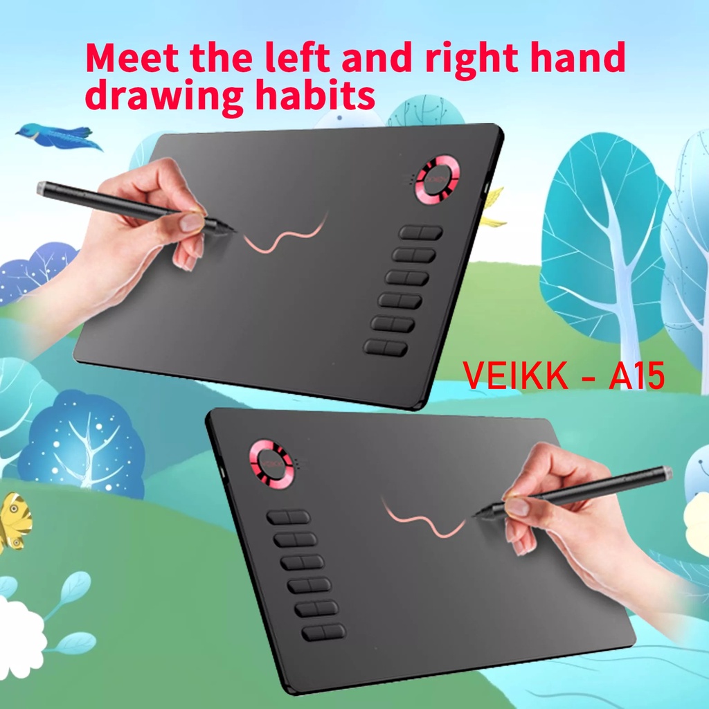 Bảng vẽ Veikk A15 (4 màu thời trang), vùng hoạt động 10 x 6in, độ phân giải 5080lpi, độ phản hồi 250pps, độ cảm ứng 10mm, 12 phím tắt tùy biến, bút cảm ứng P002 không pin 8192 mức lực nhấn, , kết nối USB-C.