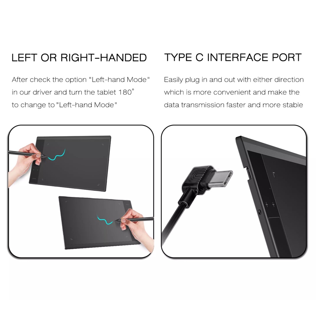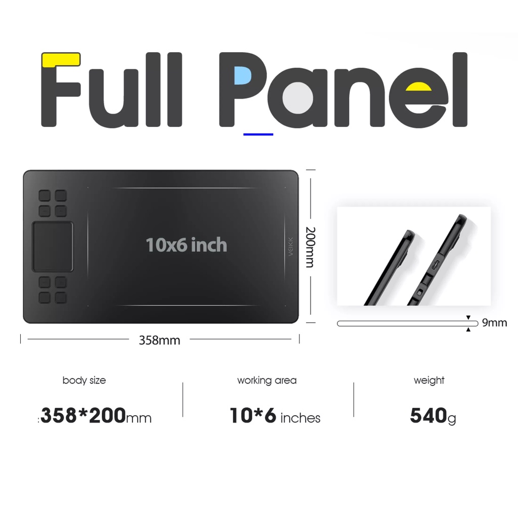 Bảng vẽ siêu mỏng Veikk S640, vùng hoạt động 6 x 4in, độ phân giải 5080lpi, độ phản hồi 230pps, độ cảm ứng 10mm, trọng lượng chỉ 176g, bút cảm ứng P001 không pin 8192 mức lực nhấn, , kết nối Micro USB.