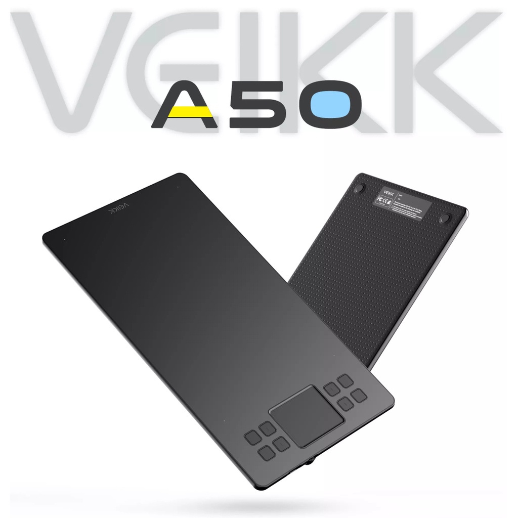 Bảng vẽ Veikk A50 Touch, vùng hoạt động 10 x 6in, độ phân giải 5080lpi, độ phản hồi 250pps, độ cảm ứng 10mm, 8 phím tắt tùy biến + cảm ứng TouchPad, bút cảm ứng P002 không pin 8192 mức lực nhấn, , kết nối USB-C.