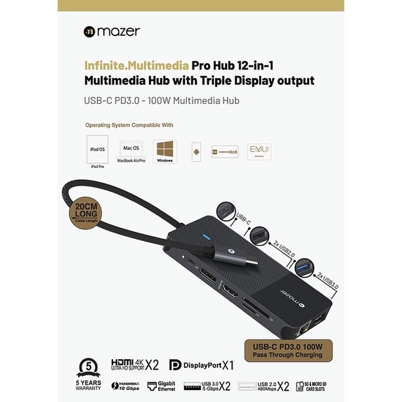 Biến một kết nối USB-C duy nhất thành 12 cổng (4K30Hz HDMIX2, VGA FULL HD1080PX1, DP X 1, Cổng Gigabyte LAnX1, 4 x USB-A, Khe cắm thẻ nhớ Micro SD / SD & Sạc USB-C 100W Cổng)
