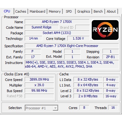 CPU AMD Ryzen 7 1700x 3.4 GHz (Up to 3.8GHz) / 20MB / 8 cores 16 threats / socket AM4.