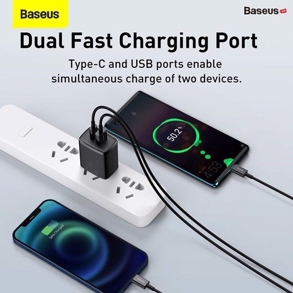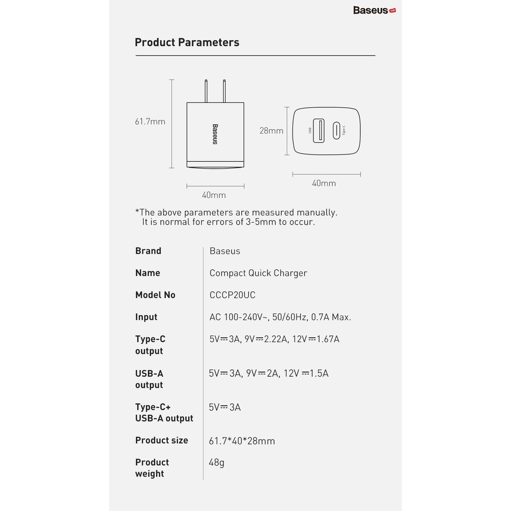 Củ Sạc Baseus Siêu Nhỏ Gọn 20W Compact Quick Charger (USB + Type C, công suất 20W)