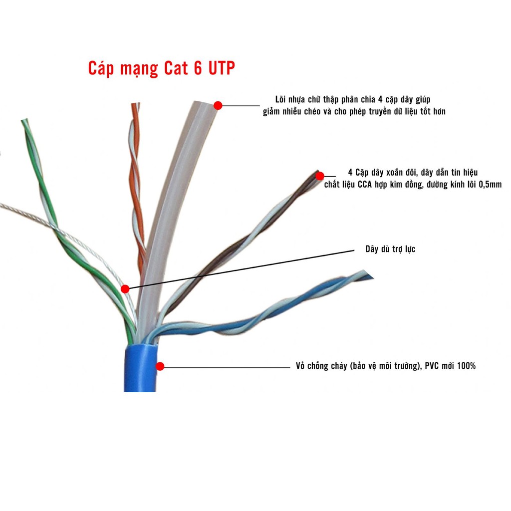 Cáp mạng HT-Cable CAT6 UTP CCA BR được sử dụng chất liệu CCA cho mạng LAN 10/100/1000 Base-T/Gigabit Ethernet ; Token Ring; Analog/Digital Video; ISDN; VoIP. (Băng thông 250 Mhz). Bên cạnh đó, mỗi cặp dây xoắn đôi được xoắn chặt với nhau để tránh nhiễu chéo cross-talk.