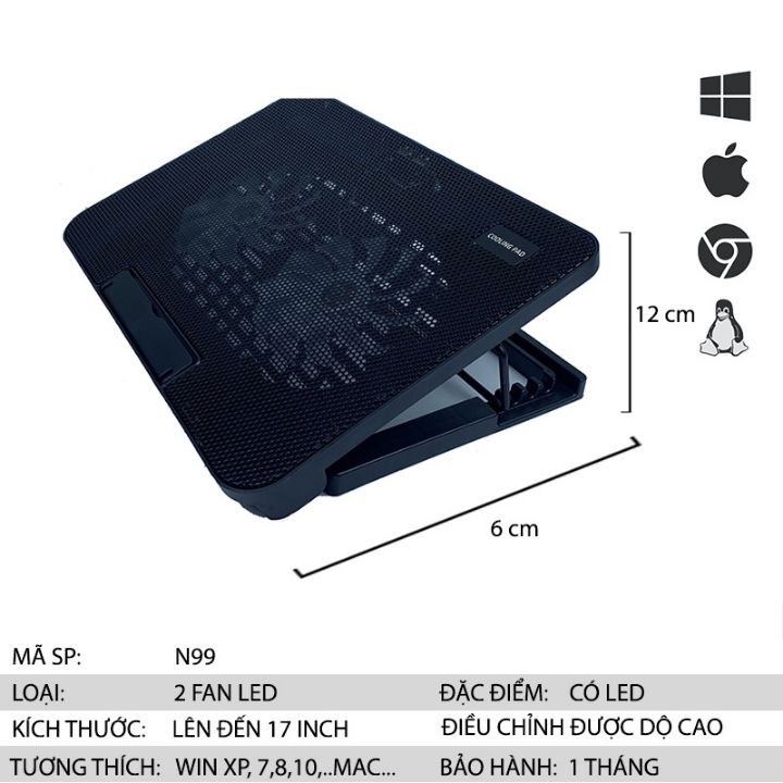 -Đế tản nhiệt n99 laptop Có 2 quạt to chạy làm mát cực nhanh chạy êm, lượng gió mạnh thích hợp cho mọi dòng máy, sản phẩm không gây tiếng ồn, với thiết kế thông minh giúp chống bụi và tăng tuổi thọ cho laptop.