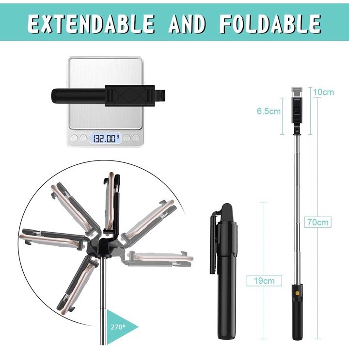 - Đa năng: gậy chụp ảnh tự sướng, giá đỡ điện thoại xem phim, live stream, Tripod chụp ảnh từ xa với nút bấm Bluetooth
