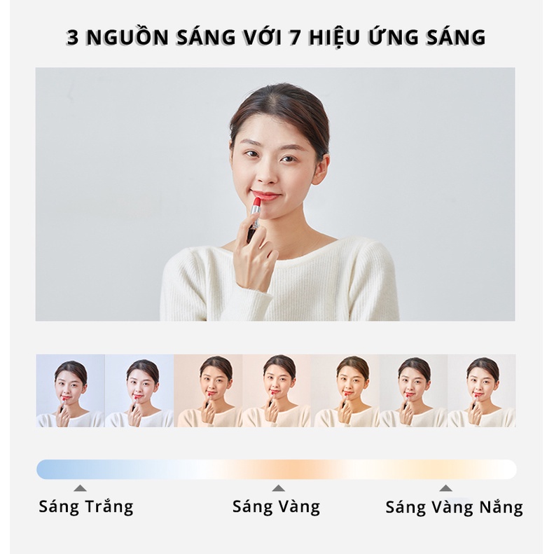 - Tích hợp 2 mặt bóng đèn led với 100 bóng đèn màu trắng và màu ấm đan xen lẫn nhau. Với 7 tùy chọn ánh sáng khác nhau, bạn có thể tùy chỉnh màu sắc ánh sáng phù hợp nhất với màu da, giúp bạn lên hình với màu sắc đẹp nhất