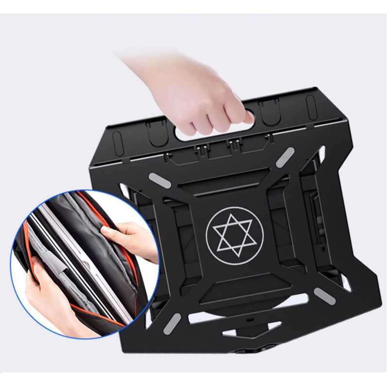 Giá đỡ laptop, macbook, ipad kiêm kê điện thoại được thiết kế bằng nhựa ABS chắc chắn với màu đen tuyền huyền bí, sang trọng tạo nên một sản phẩm vừa hữu dụng tản nhiệt, vừa trang trí khi sử dụng. Tương thích laptop và máy tính bảng: 11"~15.6", Có thể điều chỉnh độ cao với nhiều cấp độ và gấp gọn dễ ràng, Hỗ trợ hiệu quả tản nhiệt. Giúp hạn chế mỏi cổ, vai khi làm việc với máy tính. Kích thước giá đỡ máy tính, đỡ điện thoại +/ Kích thước sản phẩm: 280 x 270 x 15 CM +/ Khả năng chịu tải: 30KG +/ Có 8 góc điều chỉnh và có thể gập lại, +/ Siêu mỏng cho vào túi đựng máy tính xoay 360 độ +/ Rất vững khi đặt laptop lên và sử dụng gõ phím. +/ Tặng kềm kệ kê điện thoại. +/ Giúp cho việc sử dụng bàn phím laptop không bị vướng nhưng vẫn đảm bảo laptop không bị trượt khi sử dụng. +/ Giá đỡ laptop MacBook nhôm có thể gập gọn mang theo hàng ngày rất tiện dụng, sau khi gấp gọn kịch thước chỉ ngang 1 chiếc quạt giấy.