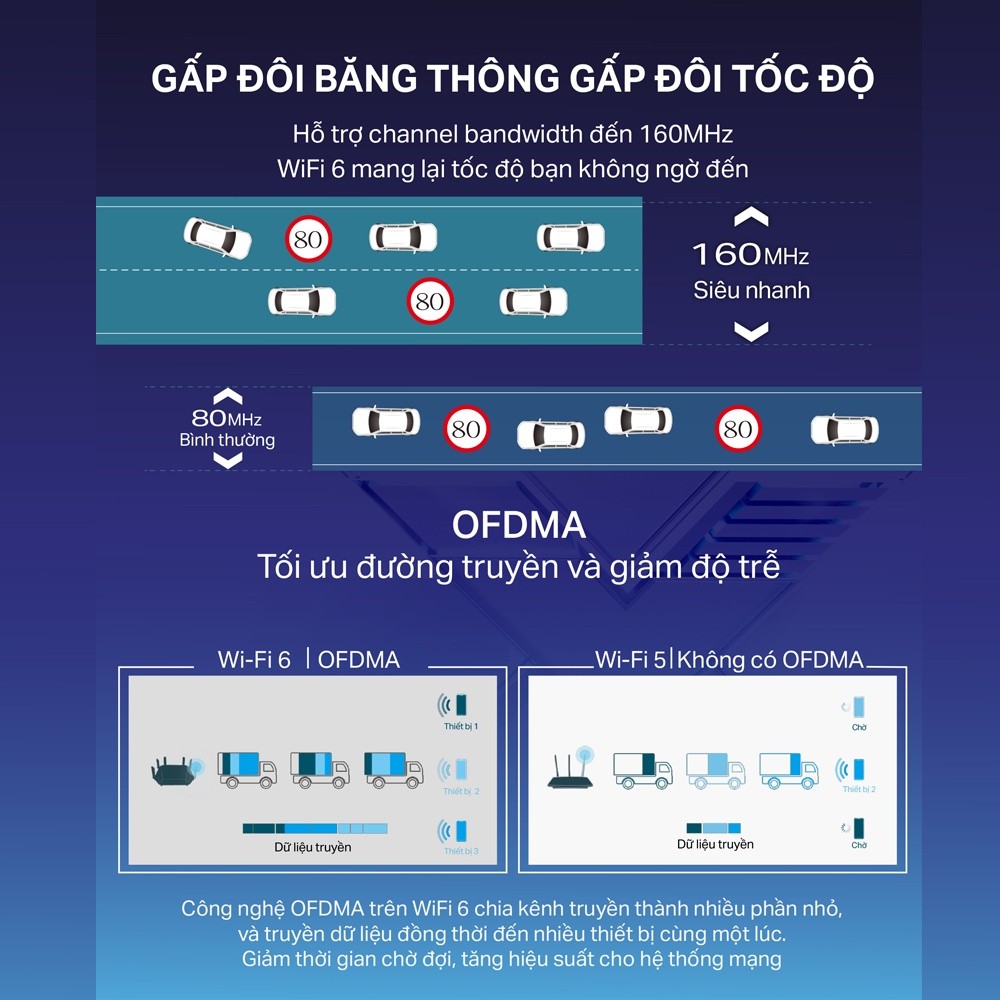 - Kết nối nhiều thiết bị hơn—Công nghệ OFDMA tăng dung lượng lên 4 lần để cho phép truyền đồng thời đến nhiều thiết bị hơn.