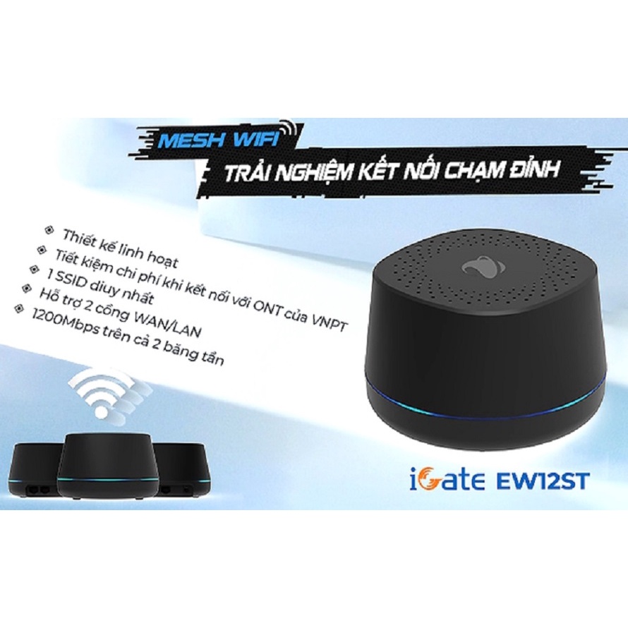 * iGate EW12ST sử dụng chuẩn công nghệ Wi-Fi tiên tiến 802.11ac wave 2, hoạt động đồng thời trên 2 băng tần 2.4GHz và 5GHz, tốc độ truyền tải không dây có thể đạt tới 1200Mbps, có khả năng kết nối nhiều thiết bị với nhau thiết lập một mạng Wi-Fi Mesh đồng nhất với chỉ một SSID.* Thiết bị có khả năng hoạt động như một Wi-Fi Router cung cấp kết nối Wi-Fi , dịch vụ WAN thông qua kết nối Ethernet hoặc Wi-Fi Repeater (thu lại sóng Wi-Fi từ các Access Point khác và chia sẻ kết nối cho người dùng). Đặc biệt với chức năng Mesh, thiết bị dễ dàng thiết lập mở rộng vùng phủ Wi-Fi, tạo trải nghiệm xuyên suốt, chất lượng cao. Thiết bị hướng tới đối tượng sử dụng là hộ gia đình, văn phòng, các doanh nghiệp vừa và nhỏ.