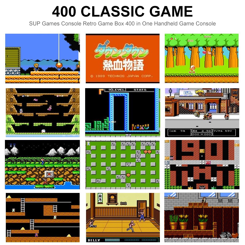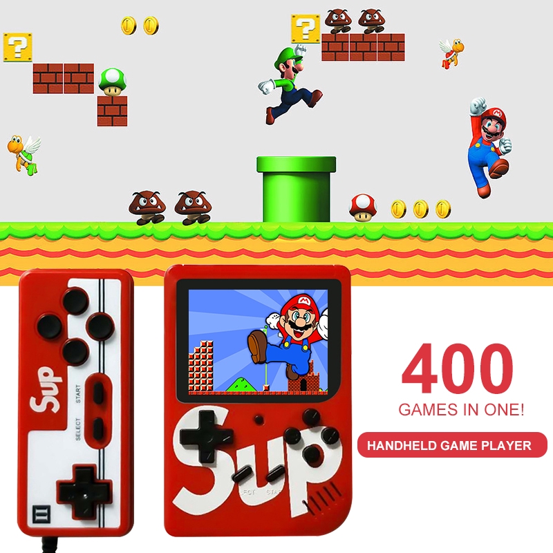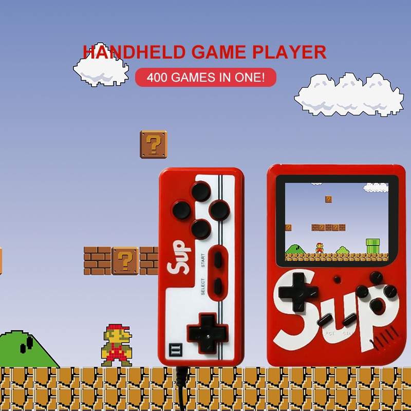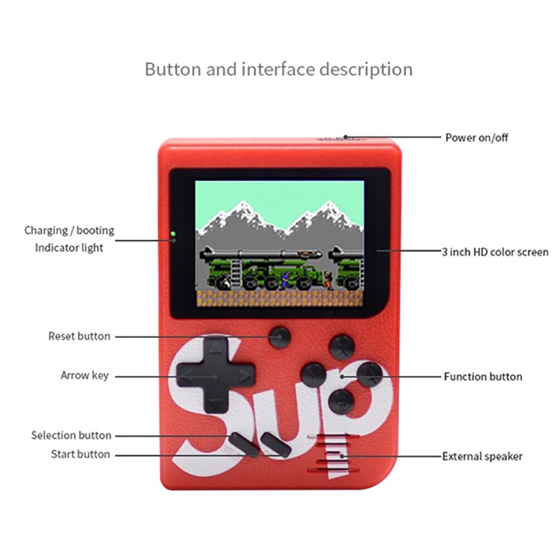Sup Game Box Gameboy Retro Game Station 400 In 1 Double Handheld Sup Gameboy Console Feature: 1.Built-in 400 Classical Games: It's a good gift for your children, friends, both boys and girls will like it. 2.3.0 Inches TFT Color Screen: High definition display, precise images transmission without delaying. 3.Adapted AV Cable: Applicable to TV system, so that you can easily enjoy vivid and exciting games on a big screen. 4.Play Longer: 800mAh rechargeable lithium battery support up to 4-5 hours of continuous game play. 5.Mini Handheld Design: Compact size and lightweight, convenient for carrying. Relaxed yourself at anywhere anytime. 6.With an additional gamepad: Two people can play against the game on the same console, which will greatly increase the fun of the game. Specification: Material: ABS Color: Red, Black, Blue (Optional) Screen: 3-inch TFT Screen Games: Built-in 400 Classical Games Battery: 800mAh Rechargeable Lithium Battery Battery Life: 4-5 Hours Item Size: 8*11.5*2.3CM Note: 1,Before connect to a TV. Make sure that your TV and the unit are turned off. 2,Switch the channel on TV to the Audio/Video channel. Battery notice: 1,Do not short circuit battery contacts 2,Do not dispose of batteries in fire 3,Remove the batteries from the unit if sit will not be used for an extended period of the time." Package List: 1 * Handheld game player 1 * Charging line 1 * AV Cable 1 * Gamepad 1 * User Manual