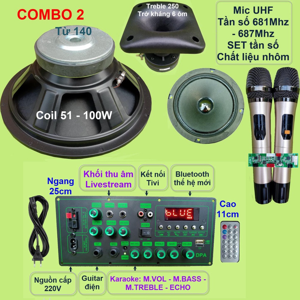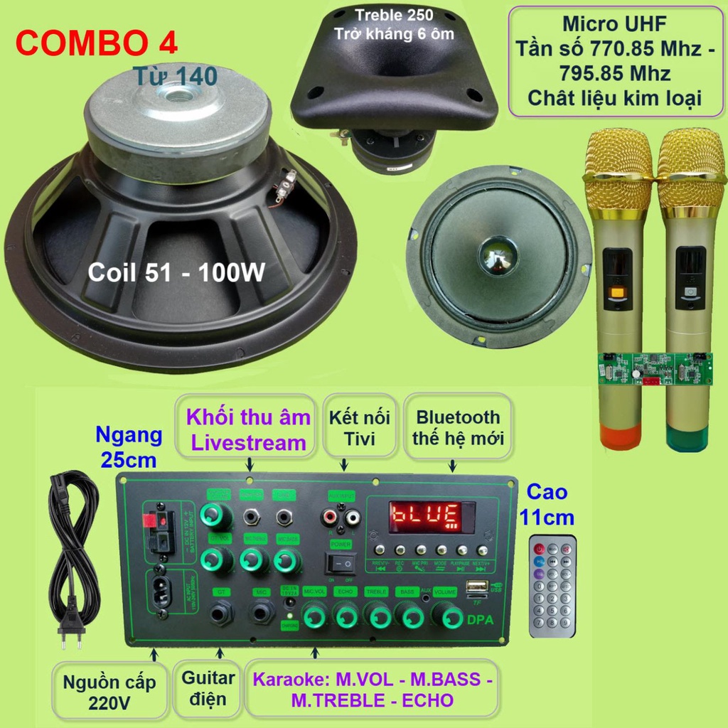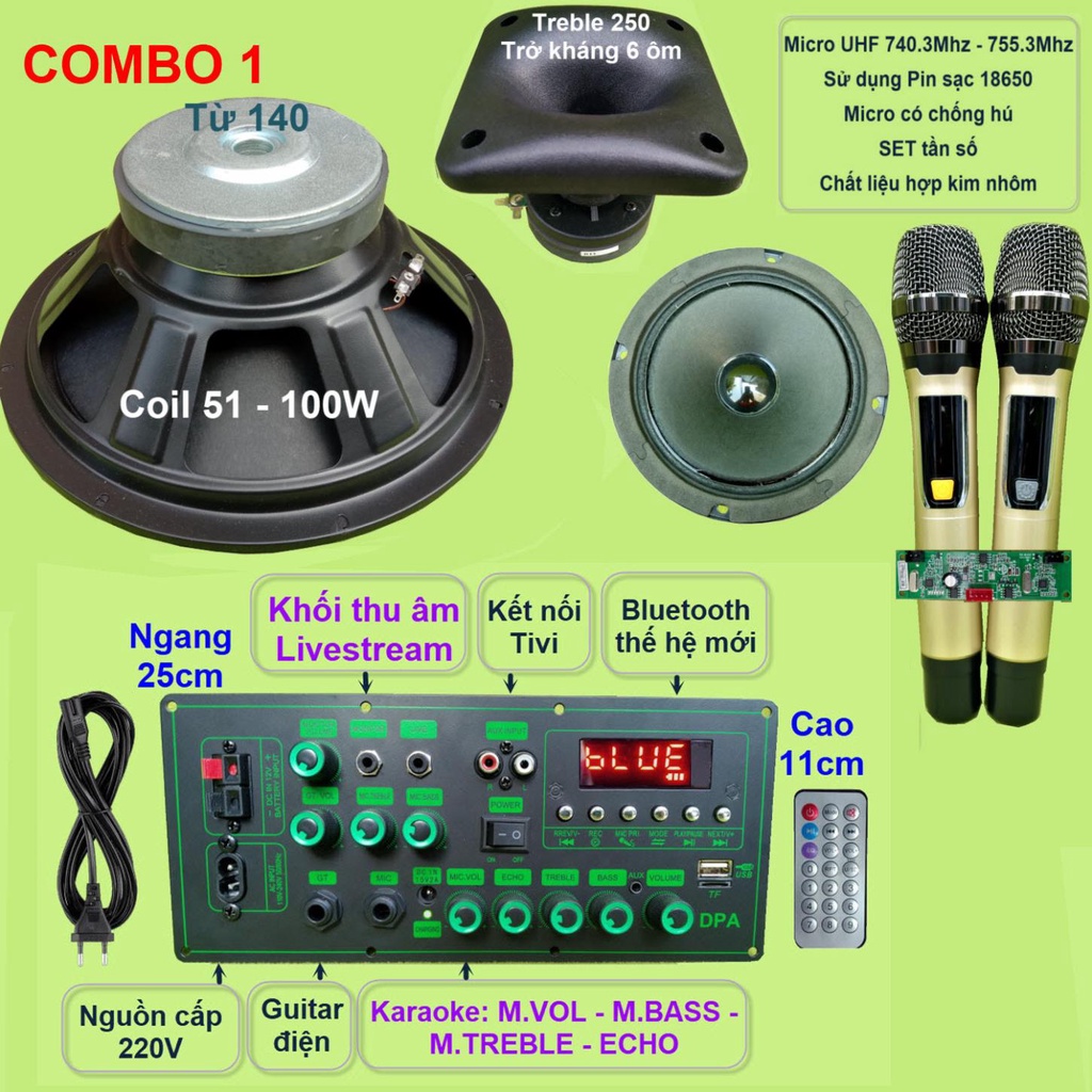 Combo gồm: 1 Mạch loa kéo (kèm phụ kiện), 1 Loa Bass 30, 1 loa Treble 250 kèm phễu, 1 loa trung 14, 1 bộ Micro không dây như hình.