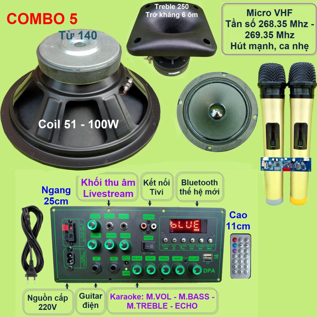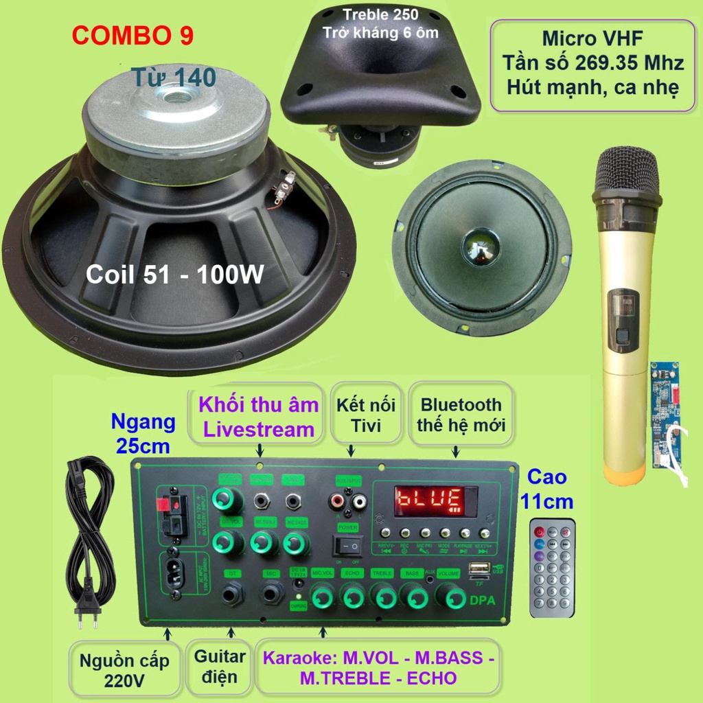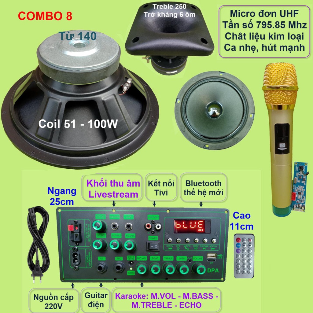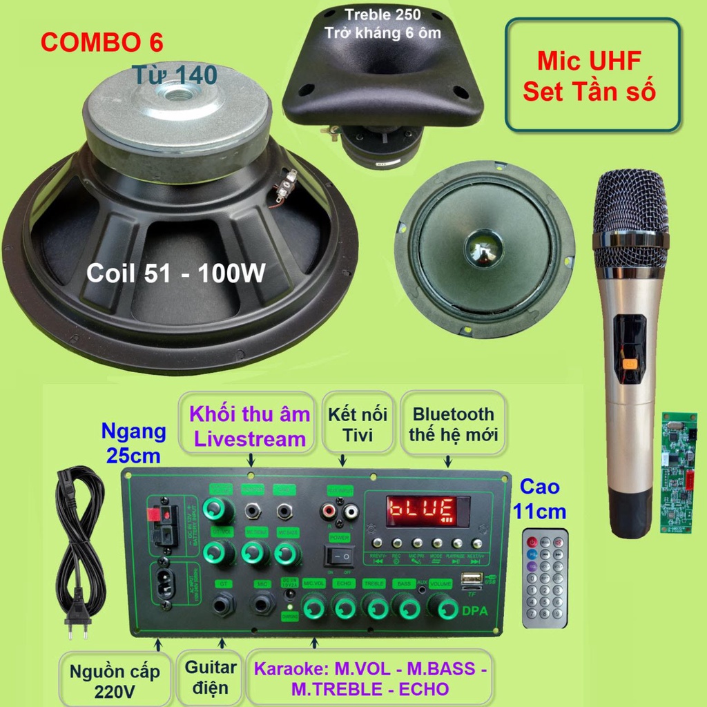 Combo gồm: 1 Mạch loa kéo (kèm phụ kiện), 1 Loa Bass 30, 1 loa Treble 250 kèm phễu, 1 loa trung 14, 1 bộ Micro không dây như hình.