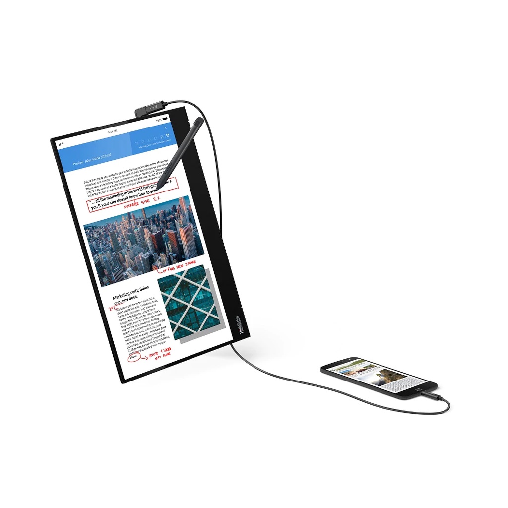 Độ linh hoạt và tương tác giữa màn hình mà công việc được tăng lên khi chức năng cảm ứng được Lenovo ThinkVision M14T coi là phần thiết yếu. Cảm ứng nhạy bén cùng việc cung cấp bút cảm ứng đặt riêng biệt giúp công việc trở nên nhẹ nhàng và hiện đại hơn. Bút đi kèm của ThinkVision M14t có độ nhạy giúp các thao tác vẽ, phác thảo, điều hướng luôn chính xác. Bạn dễ dàng note lại ý kiến, chỉnh sửa thiết kế hoặc dự án chỉ với 1 thao tác, giúp tạo ra môi trường linh động và hiện đại với cổng hỗ trợ USB-C khi kết hợp các thiết bị tương thích.