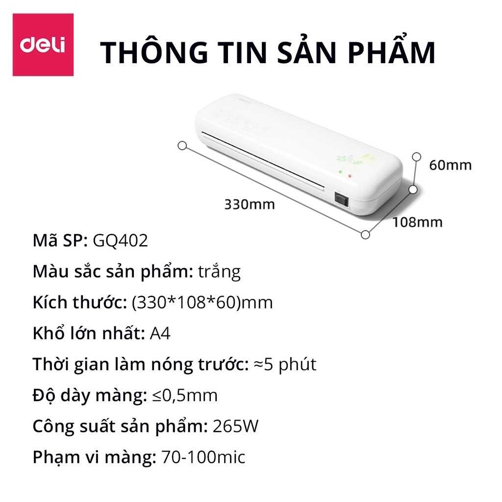 THÔNG TIN SẢN PHẨM: ✔️Tên sản phẩm: Máy ép nhựa dẻo màng plastic chính hãng Deli ✔️Mã sản phẩm: E2132 ✔️Kích thước (mm) : 330x108x60 mm TÍNH NĂNG SẢN PHẨM: ✦Máy ép plastic vỏ nhựa A4 ✦Độ dày ép nhựa dày nhất ≤0.5mm ✦Độ rộng bản ép : 230mm (ép khổ A4 ✦Dừng lại bằng tay, tốc độ ép nhựa 220mm/phút ✦Độ dày ép plastic 70-100 mic, thời gian chạy liên tục 8 tiếng ✦Tiếng ồn máy: ≤50dB ✦Công suất máy: 265W ✦Điện năng tiêu thụ: AC 220V-240V 50Hz ✦Dải nhiệt ép: 85ºC - 145ºC ✦Trọng lượng (kg): 1.0 kg ************************************************ ✔️Tên sản phẩm: Máy ép nhựa dẻo màng plastic chính hãng Deli - mẫu mới có họa tiết ✔️Mã sản phẩm: GQ402 ✔️Kích thước (mm) : 330x108x60 mm TÍNH NĂNG SẢN PHẨM: ✦máy ép plastic vỏ nhựa A4 ✦độ dày ép nhựa dày nhất ≤0.5mm ✦Độ rộng bản ép : 230mm (ép khổ A4 ✦Dừng lại bằng tay, tốc độ ép nhựa 220mm/phút ✦Độ dày ép plastic 70-100 mic, thời gian chạy liên tục 8 tiếng ✦Tiếng ồn máy: ≤50dB ✦Công suất máy: 265W ✦Điện năng tiêu thụ: AC 220V-240V 50Hz ✦Dải nhiệt ép: 85ºC - 145ºC ✦Trọng lượng (kg): 1.0 kg **Chú ý: Để đảm bảo an toàn khi sử dụng máy, xin vui lòng đọc kỹ hướng dẫn sử dụng trước khi dùng và lưu ý những trường hợp sau. 1. Không để trẻ em sử dụng máy 2. Khi sử dụng máy nên hạn chế mặc đồ như có cà vạt, thả tóc 3. Không sử dụng ghim vòng khi máy đang chạy 4. Không chạm tay vào máy/ bìa mới được ép để tránh trường hợp phỏng ------------------------------------------------------------------------------------------------------------------------------------------------------------ Deli Office Accessories Store HCM - Cửa hàng độc quyền sản phẩm tại Việt Nam Ngoài cung cấp các sản phẩm văn phòng phẩm, Deli còn cung cấp các sản phẩm thiết bị, máy móc hỗ trợ cho việc tối ưu hóa hiệu quả làm việc cho doanh nghiệp. Với phương châm luôn luôn thấu hiểu khách hàng và cung cấp các giải pháp hoàn thiện hóa và trải nghiệm mới thông qua sự đổi mới không ngừng, do đó giúp khách hàng doanh nghiệp của Deli gia tăng năng suất và hiệu quả chính xác hơn. Khách hàng lựa chọn các sản phẩm của Deli Office Accessories sẽ được cam kết: ✅Sản phẩm chính hãng từ nhà máy Deli, nguồn gốc rõ ràng và chất lượng đạt tiêu chuẩn. ✅Các sản phẩm được nghiên cứu, trải qua quá trình thử nghiệm nghiêm ngặt tại nhà máy Deli. ✅Bảo hành theo quy định của nhà sản xuất. ✅Giá cả hợp lý, cạnh tranh. ✅Hỗ trợ đổi trả hàng cho những sản phẩm bị thiếu.