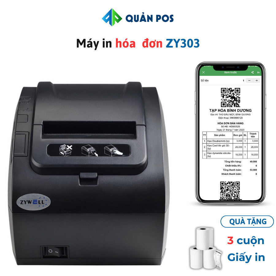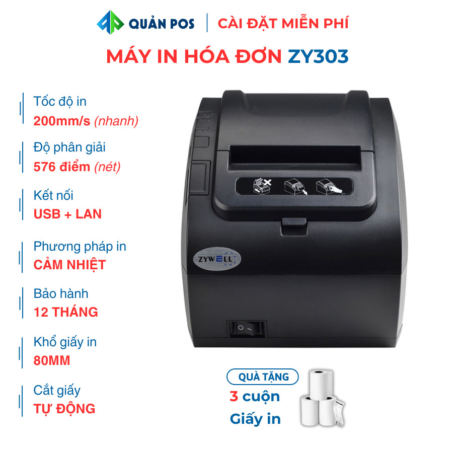 Máy in hóa đơn Zywell ZY303 đến từ thương hiệu ZYWELL với hiệu năng tốt, chất lượng in đẹp. Độ phân giải của máy là 203dpi. Chất lượng hóa đơn sẽ rõ nét và bay màu chậm. Tốc độ in nhanh 230mm/s. Khổ giấy phổ thông 80mm. Đầu in năng suất cao lên đến 150km khi in. Dao cắt chất lượng tốt khoảng 1,5 triệu lần cắt.