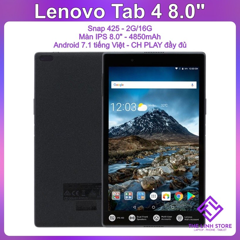 LƯU Ý : - MÁY LÀ HÀNG ĐÃ QUA SỬ DỤNG, ĐỘ MỚI TẦM 97% (TRẦY XƯỚC NHẸ) - HÌNH ẢNH SẢN PHẨM ĐỀU LÀ ẢNH THẬT CỦA MÁY DO SHOP TỰ CHỤP - BỘ SẢN PHẨM BÁN RA BAO GỒM: MÁY, CỦ SẠC, CÁP SẠC - SẢN PHẨM ĐƯỢC BẢO HÀNH 3 THÁNG (MÀN NGUỒN 15 NGÀY), ĐỔI TRẢ 7 NGÀY NẾU LỖI. CÓ DÁN TEM BẢO HÀNH VÀ PHIẾU BẢO HÀNH KÈM THEO + Máy vẫn tải và dùng tốt các phần mềm giải trí cơ bản và có tiếng Việt đầy đủ dễ sử dụng + Máy là bản chỉ dùng WIFI, ko hỗ trợ Sim CẤU HÌNH CHI TIẾT: Lenovo Tab 4 8.0 (mã TB-8X04F) - Máy chỉ hỗ trợ WIFI, ko dùng Sim - Hệ điều hành: Android 7.1 có tiếng Việt, có CH PLAY đầy đủ - CPU: Qualcomm Snapdragon 425 64bit - Đồ họa: Adreno 308 - Màn hình: IPS 8.0 inchs (1280 x 800 Pixels) - Ram: 2G - Bộ nhớ trong: 16G - Có hỗ trợ khe cắm thẻ nhớ tối đa 128G - Camera trước: 2 MP - Camera sau: 5 MP - Pin: 4850 mAh - Kích thước: 211 mm x 124 mm x 8.3 mm - Trọng lượng: 320g