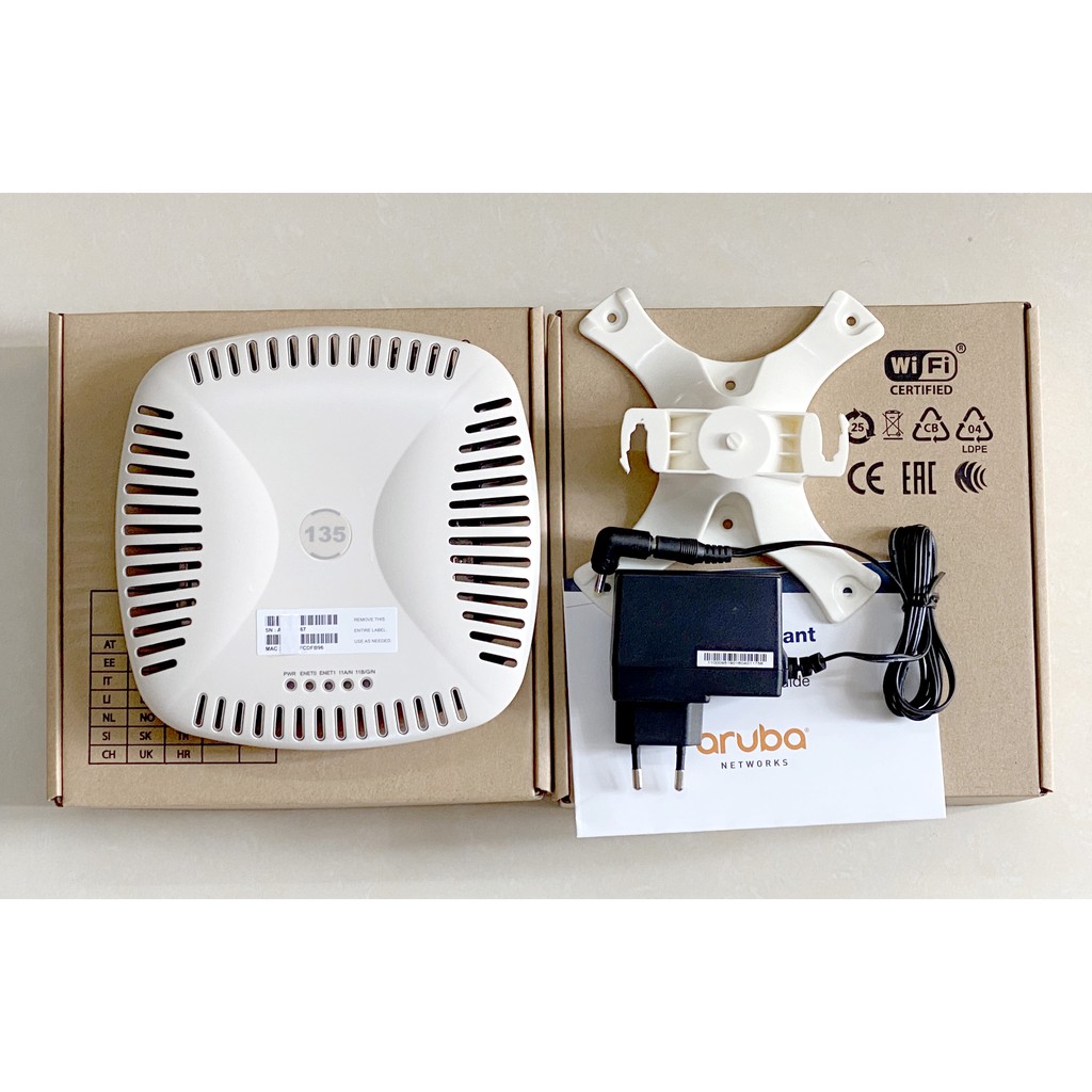 - Hổ trợ cấu hình sẵn về sử dụng ngay. (nhắn thông tin tên wifi và pass wifi để shop cấu hình nhé) WIFI ARUBA 135 - HÀNG ĐỦ PHỤ KIỆN - AP+ ĐẾ +NGUỒN 12v + BOX - HÀNG 95% Bản Ap Chuyển IAP + HÀNG CHUẨN , KHÔNG SỬA CHỮA Thông số kỹ thuật chính : Aruba Instant IAP-135 Wireless Access Point hoạt động theo chuẩn A/B/G/N 2.4GHz và 5GHz, cổng kết nối LAN 1GB hỗ trợ PoE, cổng console RJ45. Công suất phát 2.4 gHz/5 gHz: 23 dBm Số cổng kết nối : 2 x Gigabit Công nghệ ClientMatch™ hỗ trợ lên đến 255 users cho mỗi băng tần. Hỗ trợ 16 SSID. Kỹ thuật 3x3 MIMO and 03 integrated omni-directional downtilt antennas, gia tăng vùng phủ sóng và loại bỏ điểm chết. Chế độ vận hành: Aruba Instant AP, Mobility Controller-managed AP, Remote. Tính năng Aruba Instant mode cho phép 1 AP phân phối cấu hình tới tất cả các AP khác trong mạng giúp đơn giản hóa việc cài đặt và quản lý mạng không dây. Các sản phẩm Wifi - Access Point của WiFi Aruba có nhiều đặc điểm và tính năng vượt trội so với các hãng khác, phù hợp từ hộ gia đình. thông tin sản phẩm gồm: - Aruba iap-135 - Chân đế cao - nguồn 12v1.5a - box.
