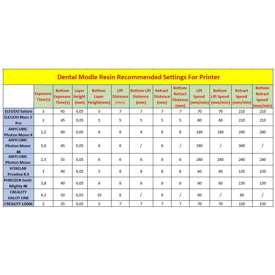**Các cài đặt đề xuất của nhựa Dental Modle Resin cho các loại Máy in Resin : https://www.esun3d.com/uploads/Dental-Modle-Resin-Recommended-Settings-For-Printer.xlsx