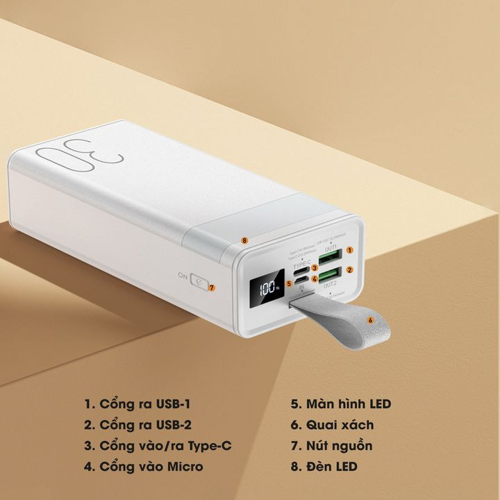 Thiết bị được trang bị lõi pin cao cấp với mật độ năng lượng cao, cho khả năng sạc đồng thời 3 thiết bị cùng lúc với cổng USB kép và cổng Type C.