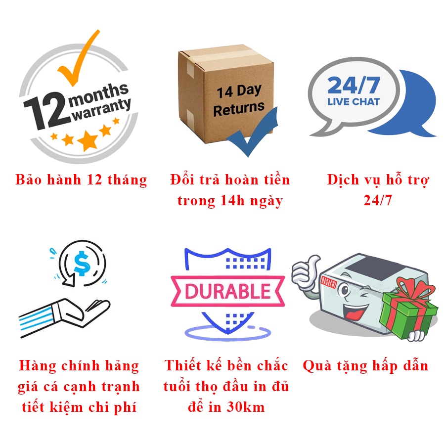 • Bảo hành nghiêm túc 3 tháng phát sinh do lỗi đầu in nếu phát sinh lỗi kỹ thuật, không bảo hành do ch áy n ổ côn trùng, do ngoại vật tác động vào sản phẩm, bào quản không đúng.