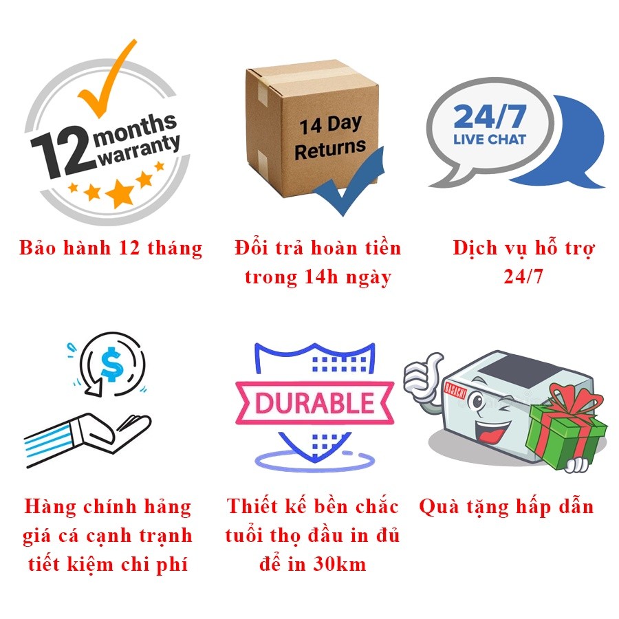 • Bảo hành nghiêm túc 3 tháng phát sinh do lỗi đầu in nếu phát sinh lỗi kỹ thuật, không bảo hành do ch_áy n_ổ côn trùng, chuột, động vật gặm nhắm cắn xé, do ngoại vật tác động vào sản phẩm, bào quản không đúng.