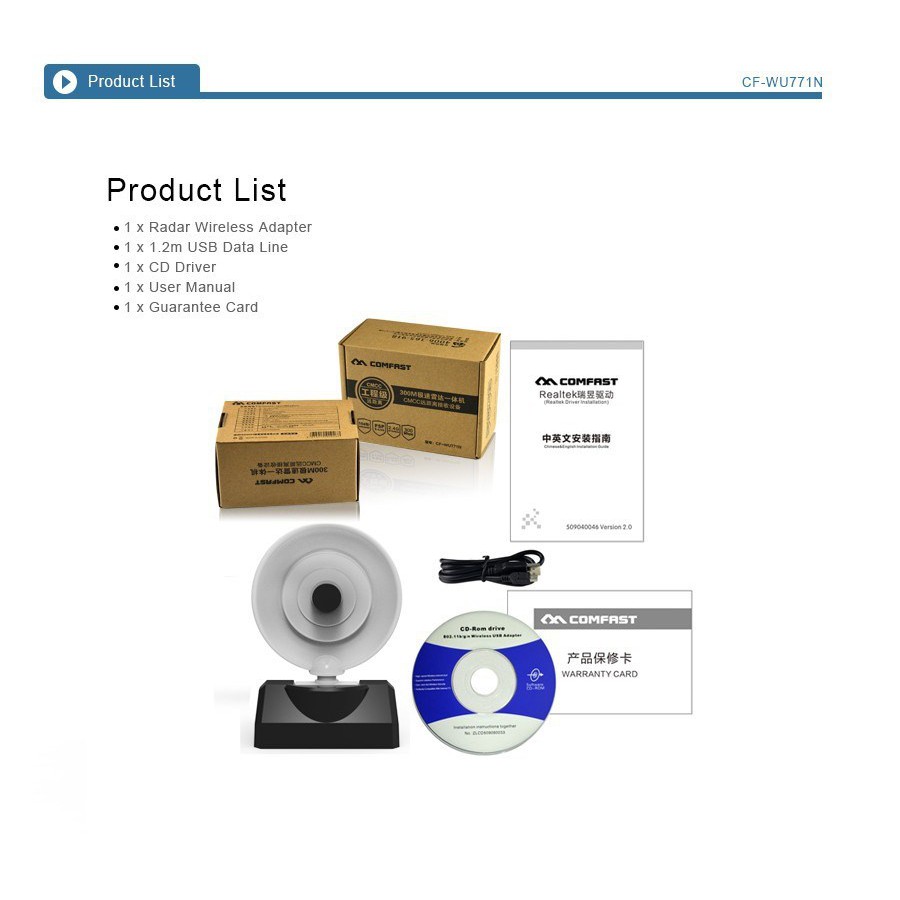 Thiết bị COMFAST CF-WU771N là một bộ chuyển đổi USB không dây công suất cao tốc độ 300Mbps, cho phép máy tính để bàn hoặc máy tính xách tay của người dùng kết nối mạng không dây cực kỳ mạnh mẽ và với hiệu suất cao. Thiết bị được thiết kế với công suất cao, đem lại phạm vi kết nối gấp 12 lần so với các bộ chuyển đổi thông thường. Khả năng nổi bật nhất của COMFAST CF-WU771N là có thể xuyên qua nhiều chướng ngại vật một cách mạnh mẽ mà vẫn không bị giảm cường độ tín hiệu khi đi qua nhiều bức tường hoặc nhiều tầng lầu.