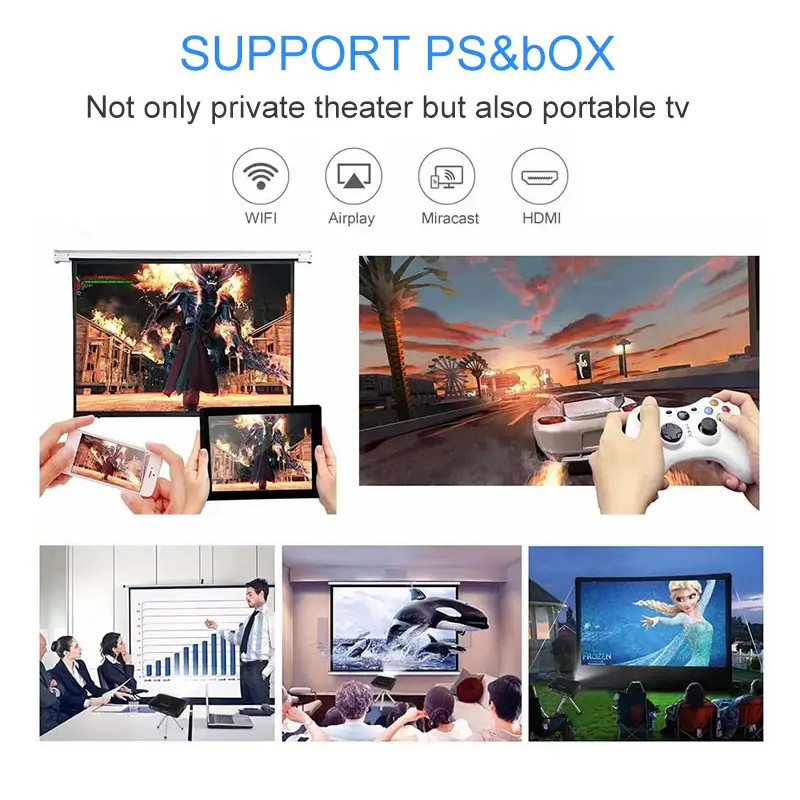 Tên sản phẩm: Máy chiếu mini tiệc tại nhà Đơn vị hình ảnh: LCD Hỗ trợ độ phân giải tối đa: 1920*1080 ---------------------------------------------- Thông tin cần thiết 1. Hệ thống: Android 2. Màu sắc: Đen, Trắng _ x005f 3. Kích thước cơ thể: 116.5*116.5*154mm 4. Trọng lượng sản phẩm: 750g Thông số quang học 1. Công nghệ hiển thị: Công nghệ hiển thị dẫn 2. Chiếu nguồn ánh sáng: dẫn nguồn ánh sáng 3. Tuổi thọ của nguồn sáng chiếu: 50000 giờ 4. Độ sáng: 1200 ANSI Lumens 5. Độ phân giải: 1920*1080 6. Kích thước chiếu: 50-150 inch 7. Tỷ lệ chiếu: 1.69:1 (50 inch @ 1m) 8. Khoảng cách chiếu: 0.8-5m 9. Tỷ lệ khung hình chiếu: 16:9 10. Chế độ lấy nét: thủ công 11. Hiệu chỉnh thang: ± 25 ° 12. Chế độ chiếu: Chiếu về phía trước 13. Biến dạng:<1.0% 14. Loa đặc điểm kỹ thuật: 4 Ω 3W độc lập âm thanh buồng